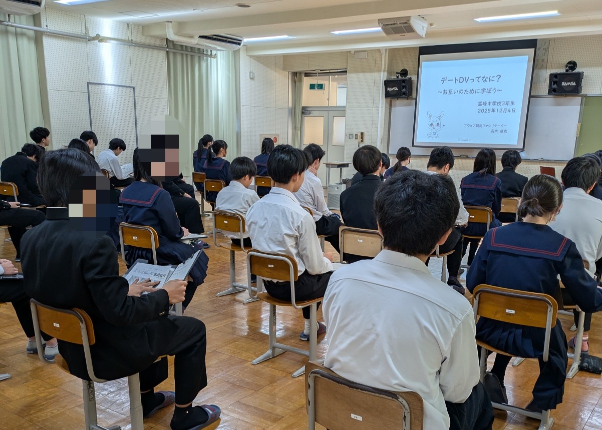 2025年11月27日 札幌市立前田中学校3年生110名のみなさんに、デートDV防止講座を届けてきました。例年より早いインフルエンザの流行で、学級閉鎖となるクラスもあり心配しましたが、無事に実施することが出来ました。90分の講座では、 「...